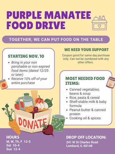 In May of 2021, I started Purple Manatee Resale in Lombard, IL because we wanted to expand our philanthropic ventures, (We also wanted our house back!) Purple Manatee Resale supports various charities and non- profits, sells items and helps those in need. I feel very lucky for the life I have and want to continue to help others.